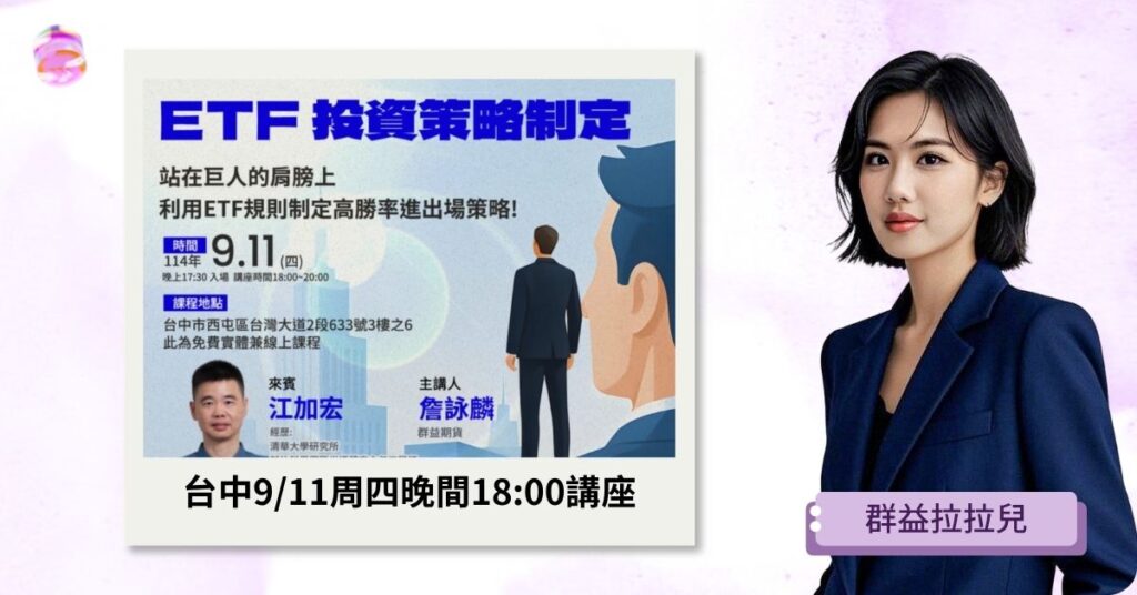 群益期貨 台中9/11周四晚間18:00講座:ETF 投資策略制定: