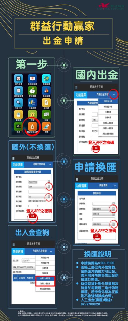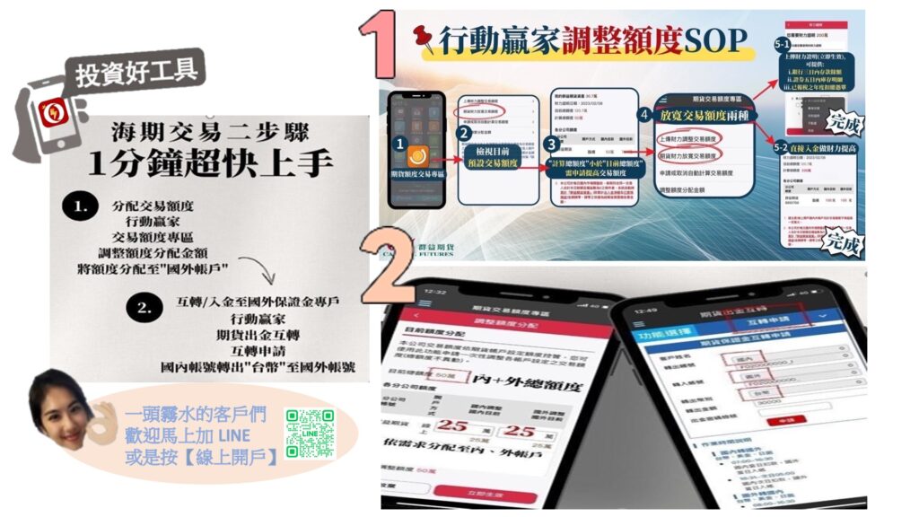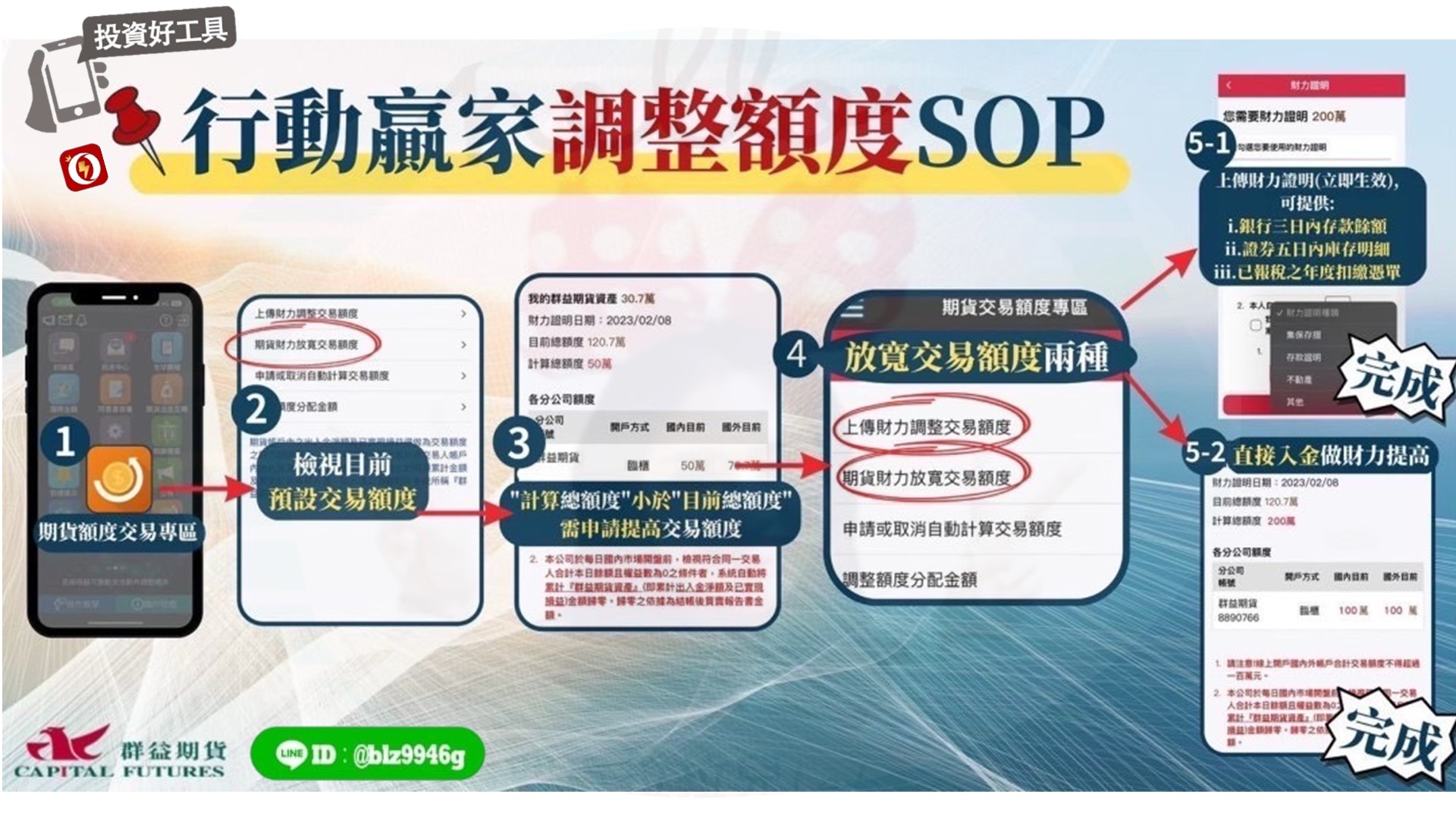 群益期貨常見Q&A 群益行動贏家沖銷明細第一步帳務、第二步内沖銷、海沖銷 第三步選擇區間 群益行動贏家出金申請 行動贏家調整額度SOP投資好工具 行動贏家調整額度SOP 步驟1上傳財力調整交易額度期貨財力放宽交易額度申請或取消自動計算交易額度 步驟2 精度分配金額 步驟3群益期貨開戶方式 國内國外目前50萬”計算總額度”小於”目前總額度”需申請提高交易額度 步驟4放寬交易額度兩種上傳財力調整交易額度期貨財力放寬交易額度申請或取消自動計算交易額度調整額度分配金額 步驟5-A上傳財力證明(立即生效),可提供:.銀行三日内款款额證券五日内庫存明細已報稅之年度扣繳憑單集保存摺、存款證明、不動産 步驟5-B直接入金做財力提高 海外期貨1分鐘快速交易兩步驟1.分配交易額度2.互轉/入金至國外保證金專戶 群益名片卡製作 聯絡諮詢方式 群益期貨曾韋菁|拉拉兒 Line:@695iyzxu 回到首頁 我要開戶 Facebook