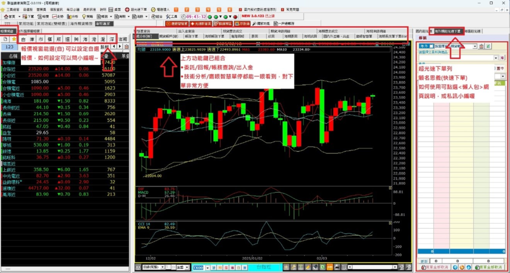 中間: 寬大的技術分析畫面可以自由畫線,配合上方切換的帳務查詢/委託/回報/出入金