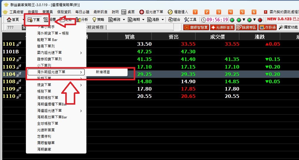 步驟1:打開策略王 點超光速下單→海外選擇權超光速下單 (如下圖)